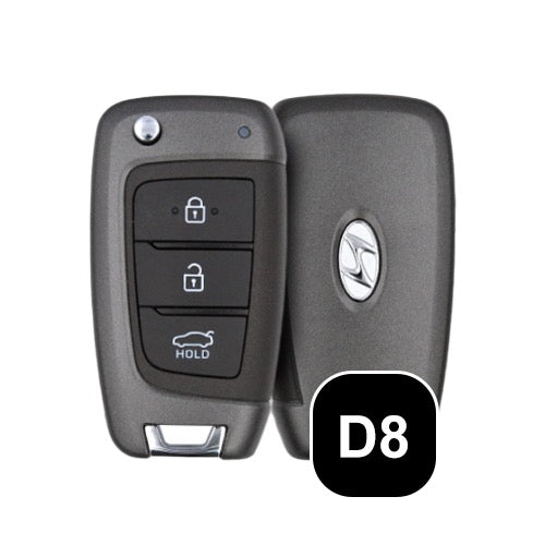 Der Hyundai D8 ist ein robuster Klappschlüssel mit mechanischem Schlüsselbart, wie er bei vielen Hyundai-Modellen der Kompakt- und Mittelklasse zum Einsatz kommt. Der Schlüsselbart klappt per Knopfdruck aus und wird zum Starten manuell ins Zündschloss gesteckt – ganz klassisch, ohne Keyless-Go-Technologie.